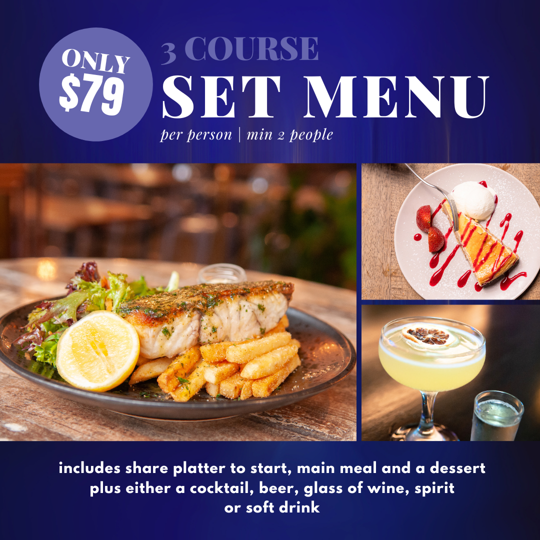 - a main course selected from below menu with options like our delicious Australian pan-fried barramundi.