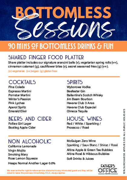 Each session is for 90 minutes and bookings are recommended. Minimum of 2 persons required for offer and everyone in your booking must be having the same bottomless offer.